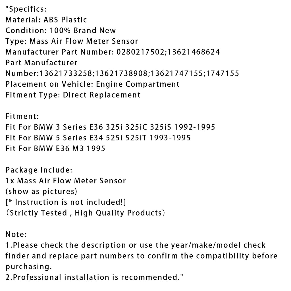 Mass Air Flow Meter Sensor For BMW E34 525i E36 325i M3 0280217502