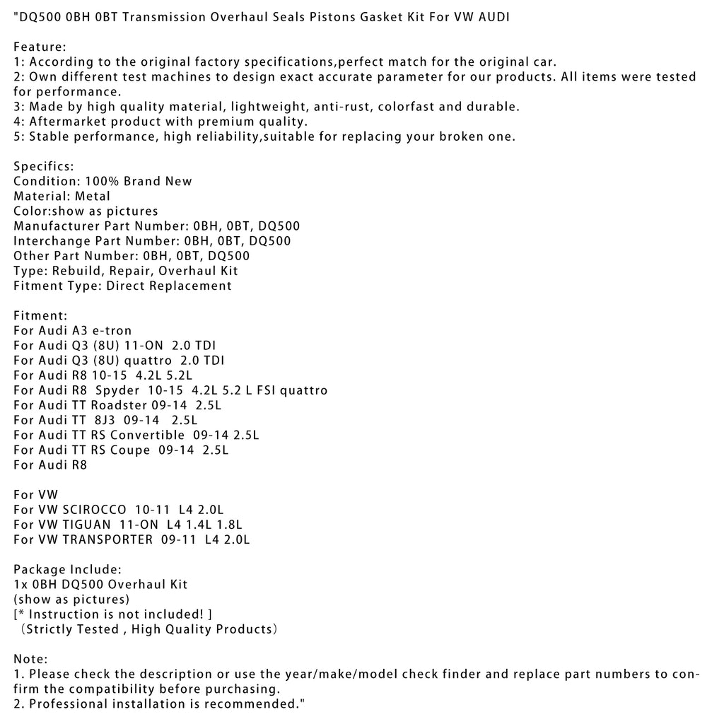 DQ500 0BH 0BT Transmission Overhaul Seals Pistons Gasket Kit For VW AUDI