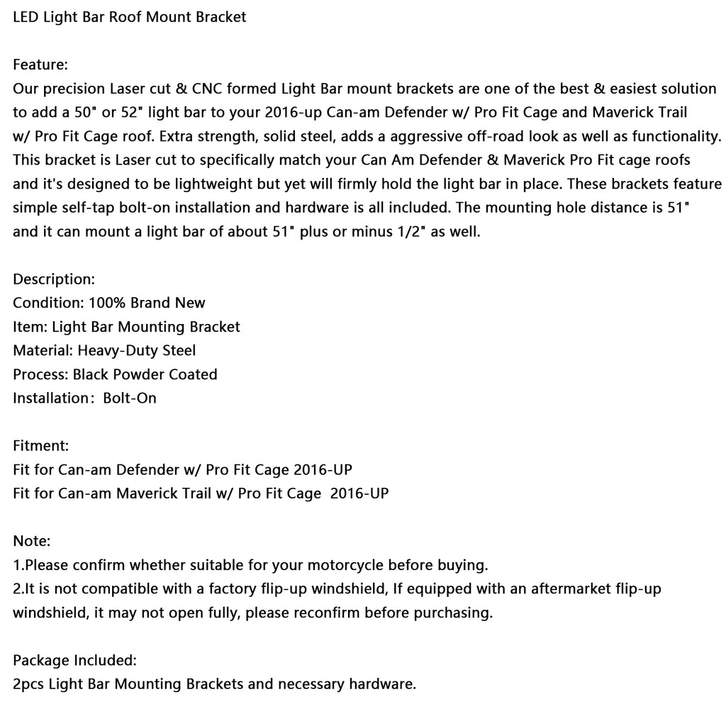 Our precision Laser cut & CNC formed Light Bar mount brackets are one of the best & easiest solution to add a 50" or 52" light bar to your 2016-up Can-am Defender w/ Pro Fit Cage and Maverick Trail w/ Pro Fit Cage roof. Extra strength, solid steel, adds a aggressive off-road look as well as functionality. This bracket is Laser cut to specifically match your Can Am Defender & Maverick Pro Fit cage roofs and it's designed to be lightweight but yet will firmly hold the light bar in place. These brackets feature simple self-tap bolt-on installation and hardware is all included. The mounting hole distance is 51" and it can mount a light bar of about 51" plus or minus 1/2" as well.