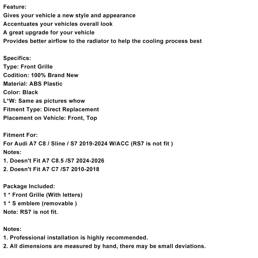 For Audi A7 C8 / Sline / S7 2019-2024 W/ACC (RS7 is not fit )