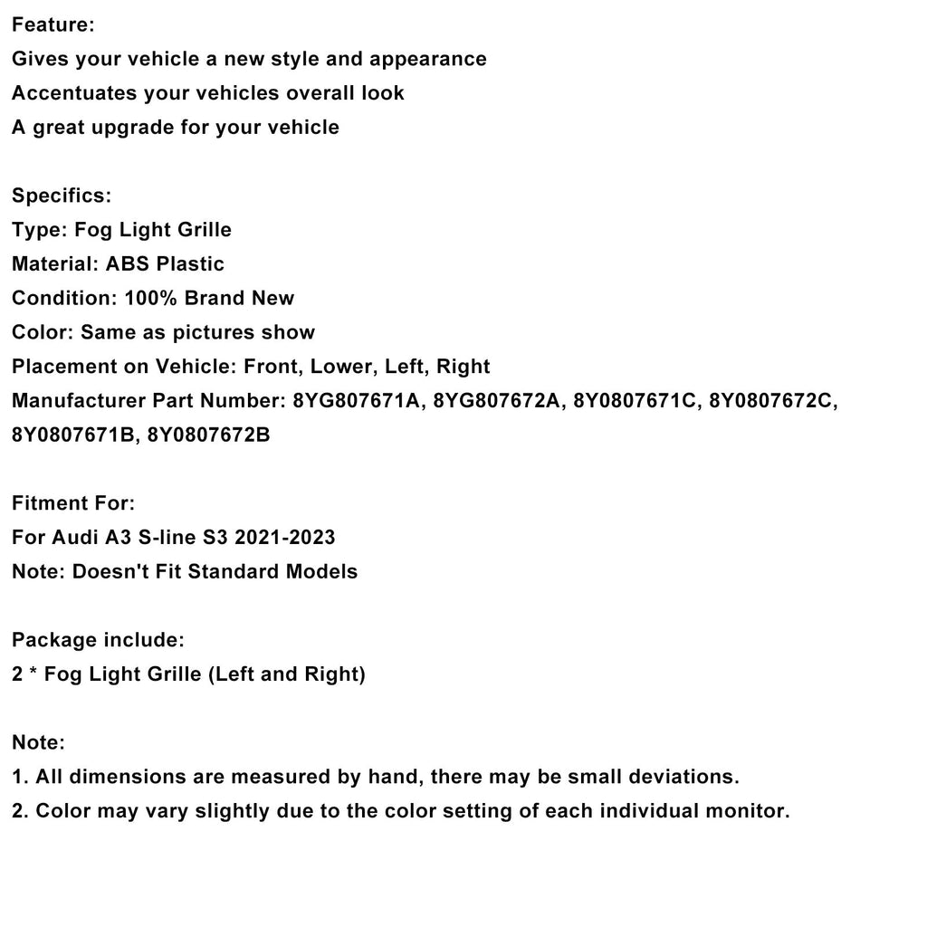 Black Front Honeycomb Fog Light Grill Cover Fit for Audi A3 S-line 2021-2023