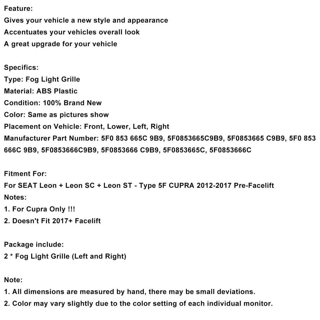Black Front Honeycomb Fog Light Grille Cover Fit for Seat Leon Cupra 5F 2012-2017