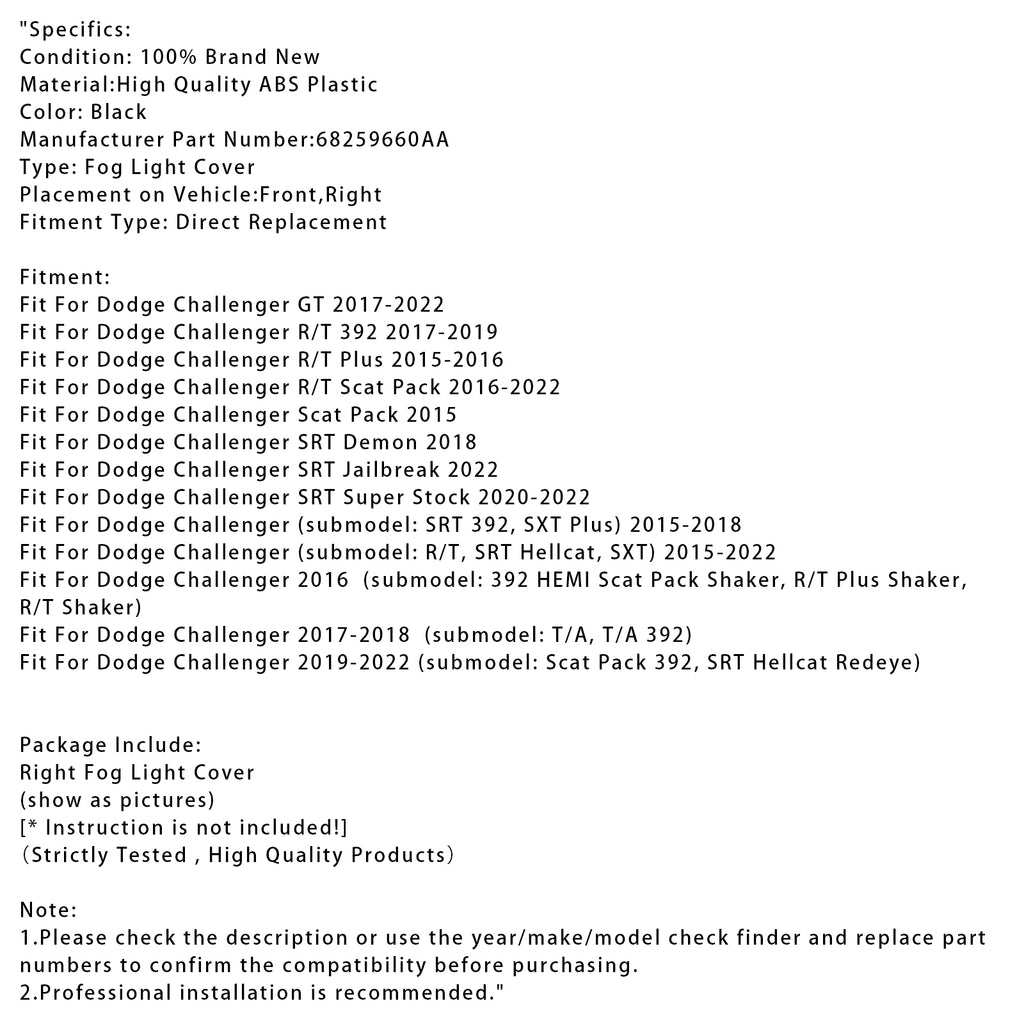 Right Side Fog Light Cover For Dodge Challenger 2015-2022 68259660AA
