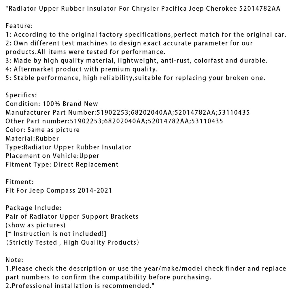 Radiator Upper Rubber Insulator For Chrysler Pacifica Jeep Cherokee 52014782AA