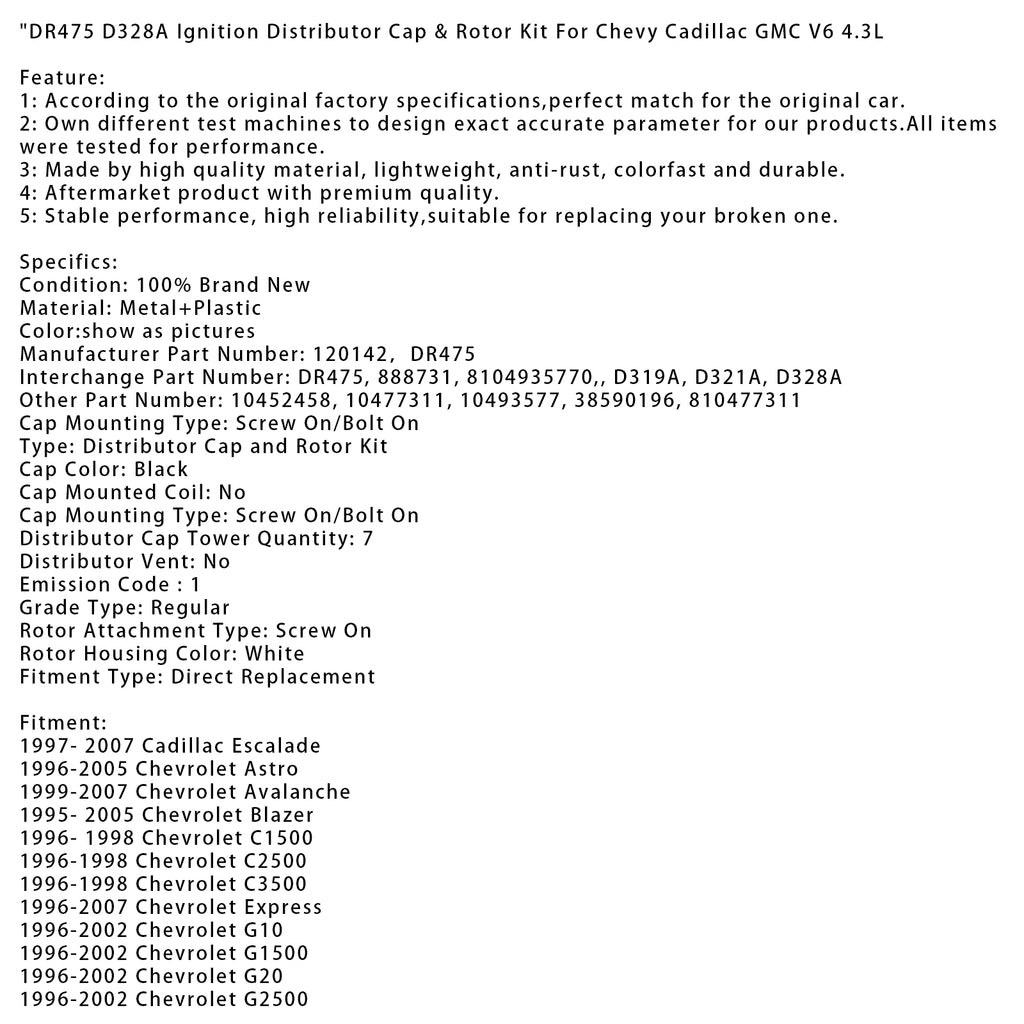 DR475 D328A Ignition Distributor Cap & Rotor Kit For Chevy Cadillac GMC V6 4.3L