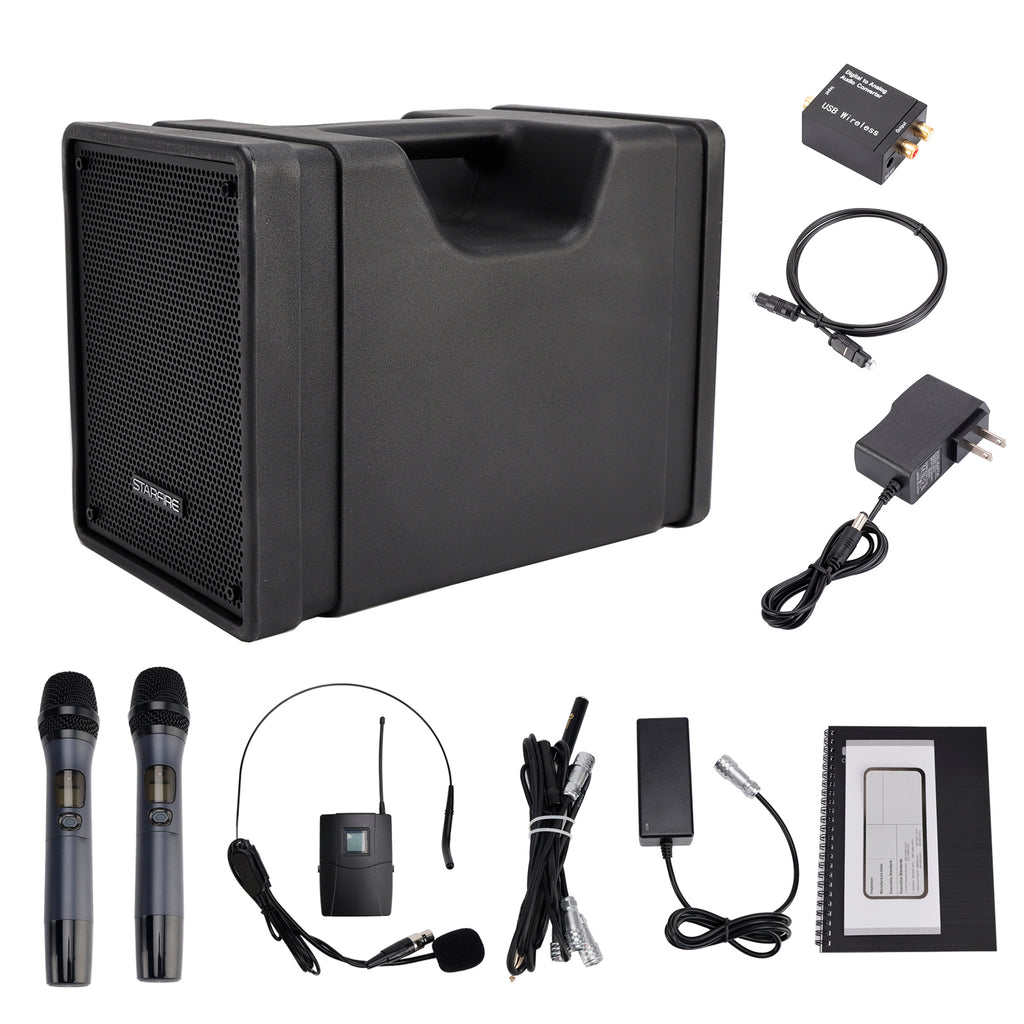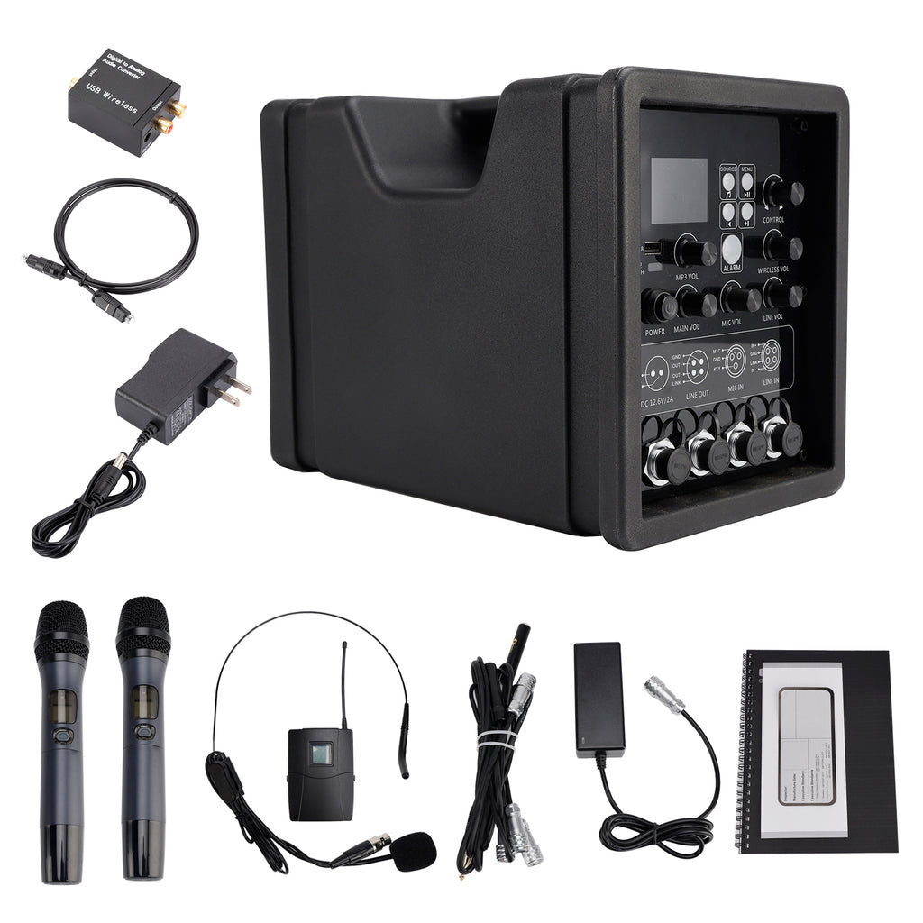 13. It features an FM receiver, wireless microphone, MP3 recorder and player, USB external audio input, and a wired microphone input.