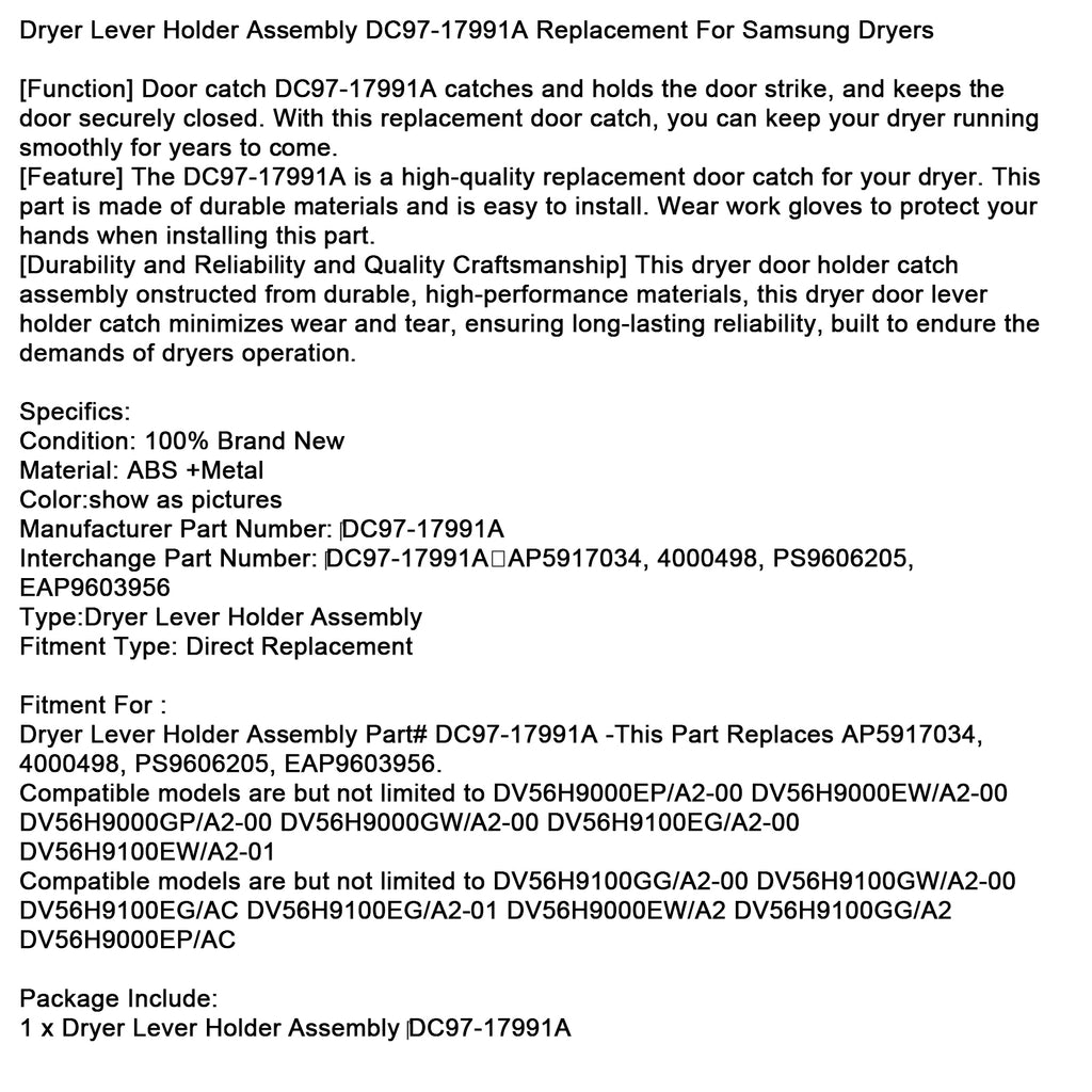 【Feature】The DC97-17991A is a high-quality replacement door catch for your dryer. This part is made of durable materials and is easy to install. Wear work gloves to protect your hands when installing this part.