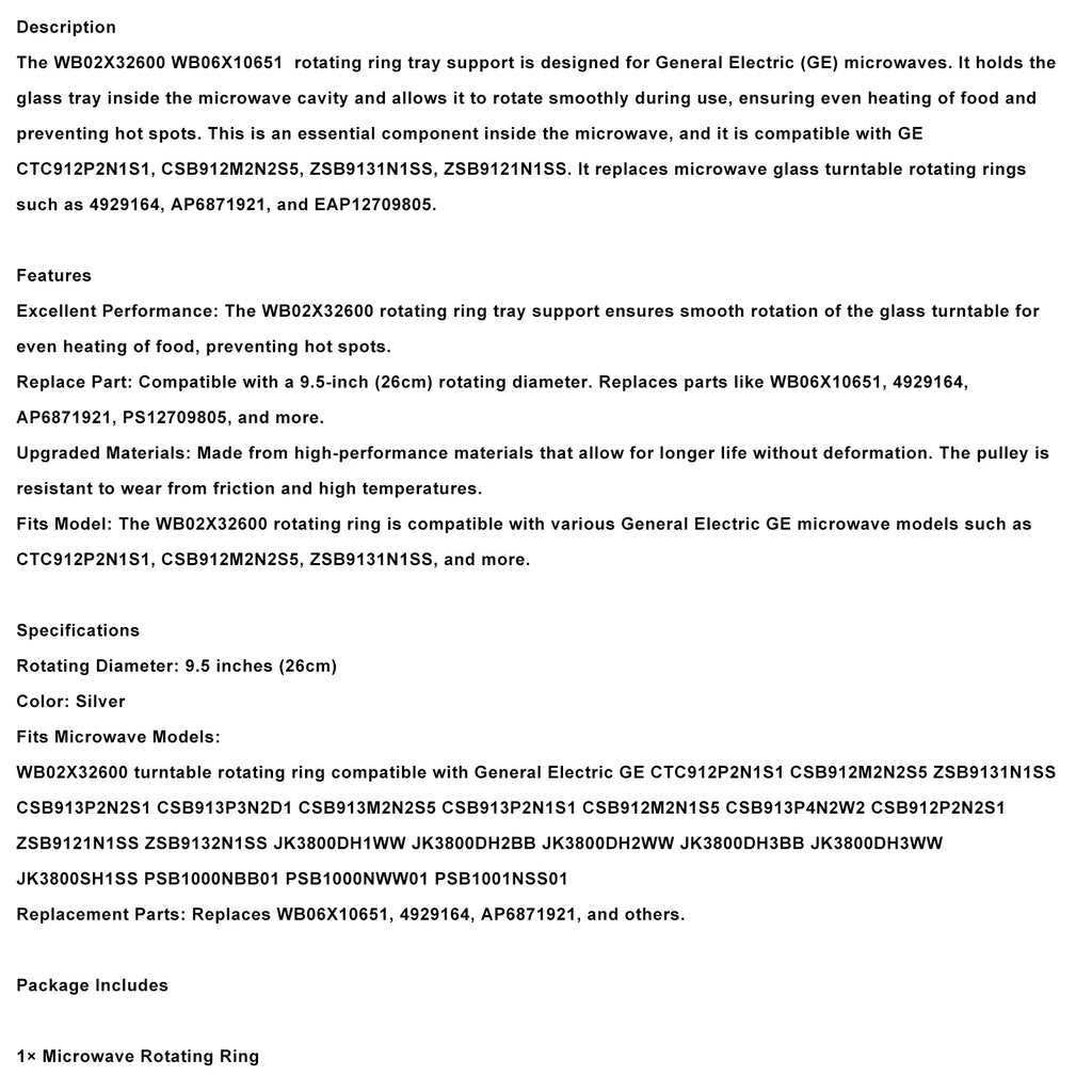 Fits Model: The WB02X32600 rotating ring is compatible with various General Electric GE microwave models such as CTC912P2N1S1, CSB912M2N2S5, ZSB9131N1SS, and more.