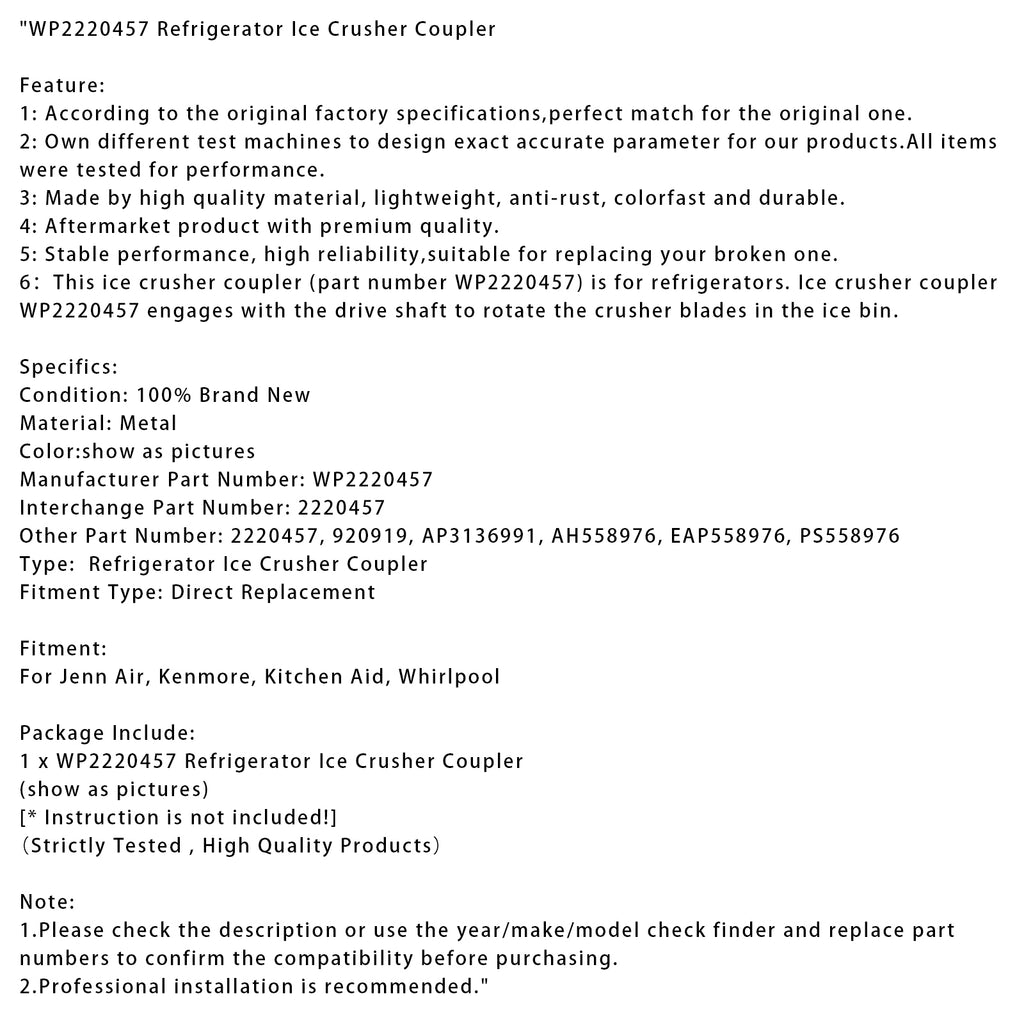 6:This ice crusher coupler (part number WP2220457) is for refrigerators. Ice crusher coupler WP2220457 engages with the drive shaft to rotate the crusher blades in the ice bin.