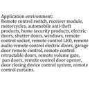 Remote control switch, receiver module, motorcycles, automobile anti-theft products, home security products, electric doors, shutter doors, windows, remote control socket, remote control LED, remote audio remote control electric doors, garage door remote control, remote control retractable doors, remote volume gate, pan doors, remote control door opener, door closing device control system, remote control curtains, alarm host, alarm, remote control motorcycle remote control electric cars, remote control MP3.