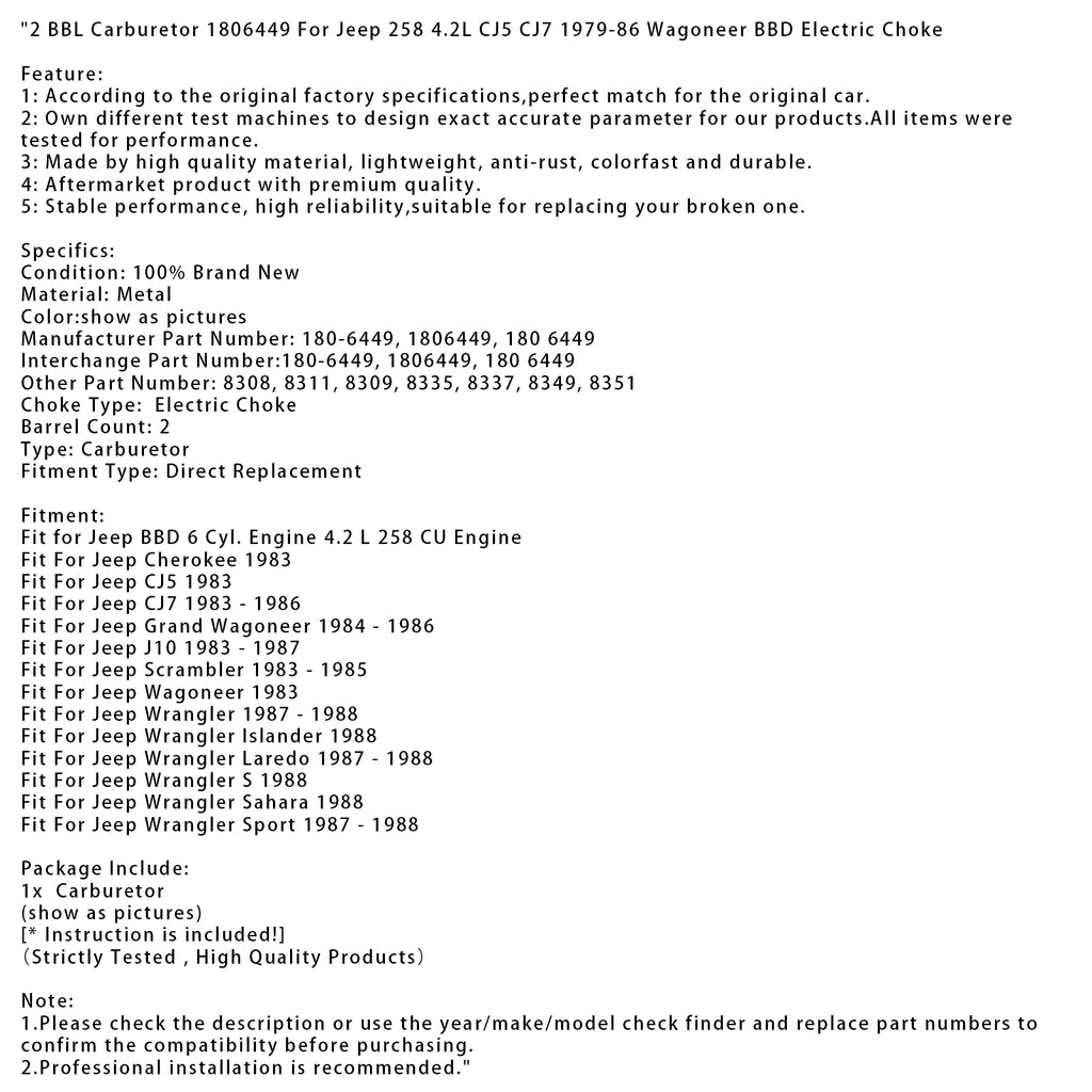 2 BBL Carburetor 1806449 For Jeep 258 4.2L CJ5 CJ7 1979-86 Wagoneer BBD Electric Choke