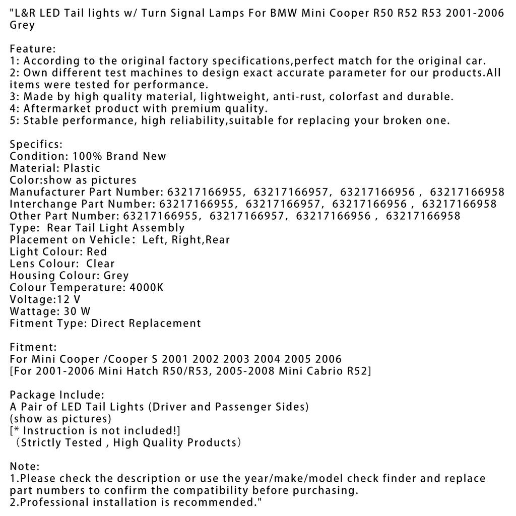 L&R LED Tail lights w/ Turn Signal Lamps For BMW Mini Cooper R50 R52 R53 2001-2006 Grey