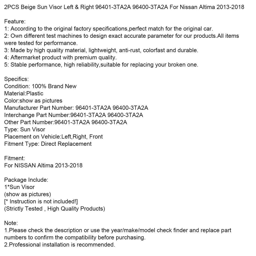 2PCS Beige Sun Visor Left & Right 96401-3TA2A 96400-3TA2A For Nissan Altima 2013-2018