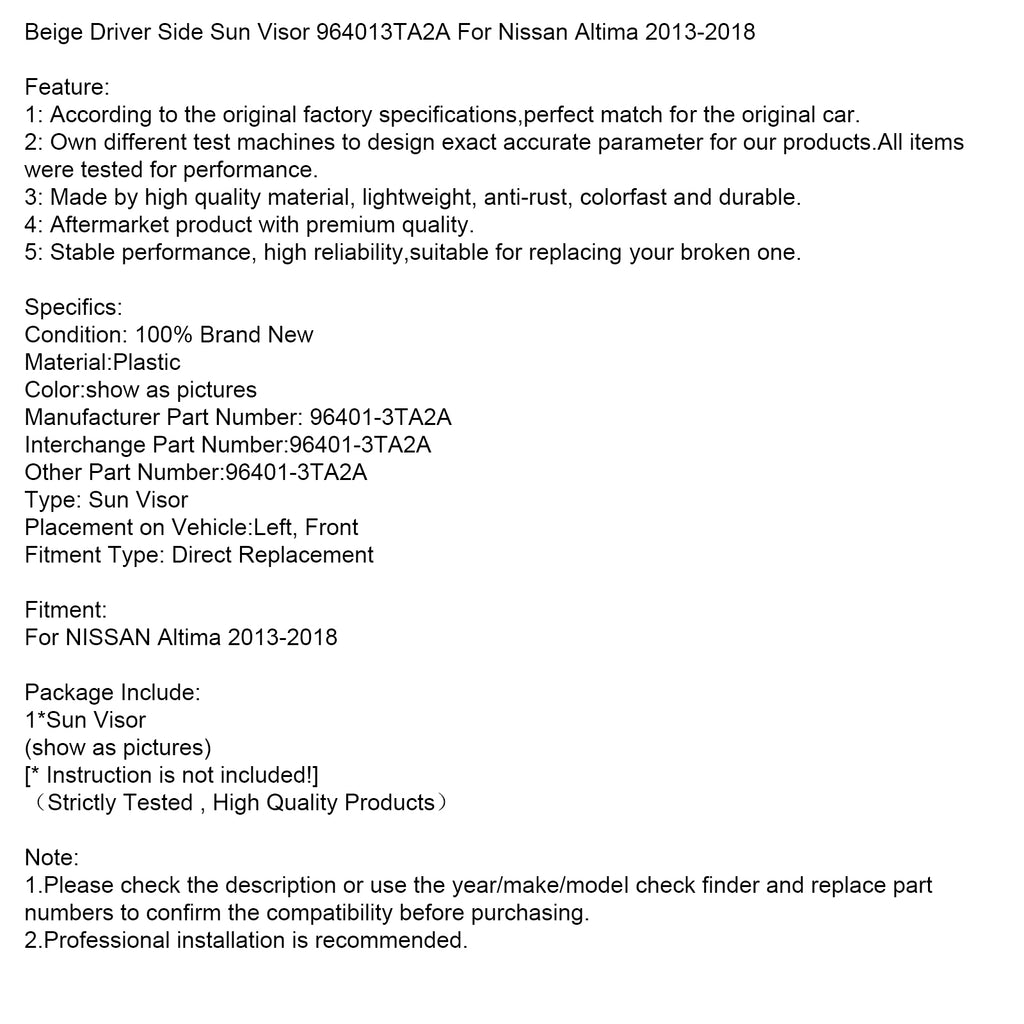Beige Driver Side Sun Visor 964013TA2A For Nissan Altima 2013-2018
