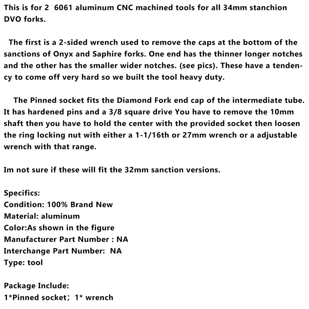 This is for 2 6061 aluminum CNC machined tools for all 34mm stanchion DVO forks.