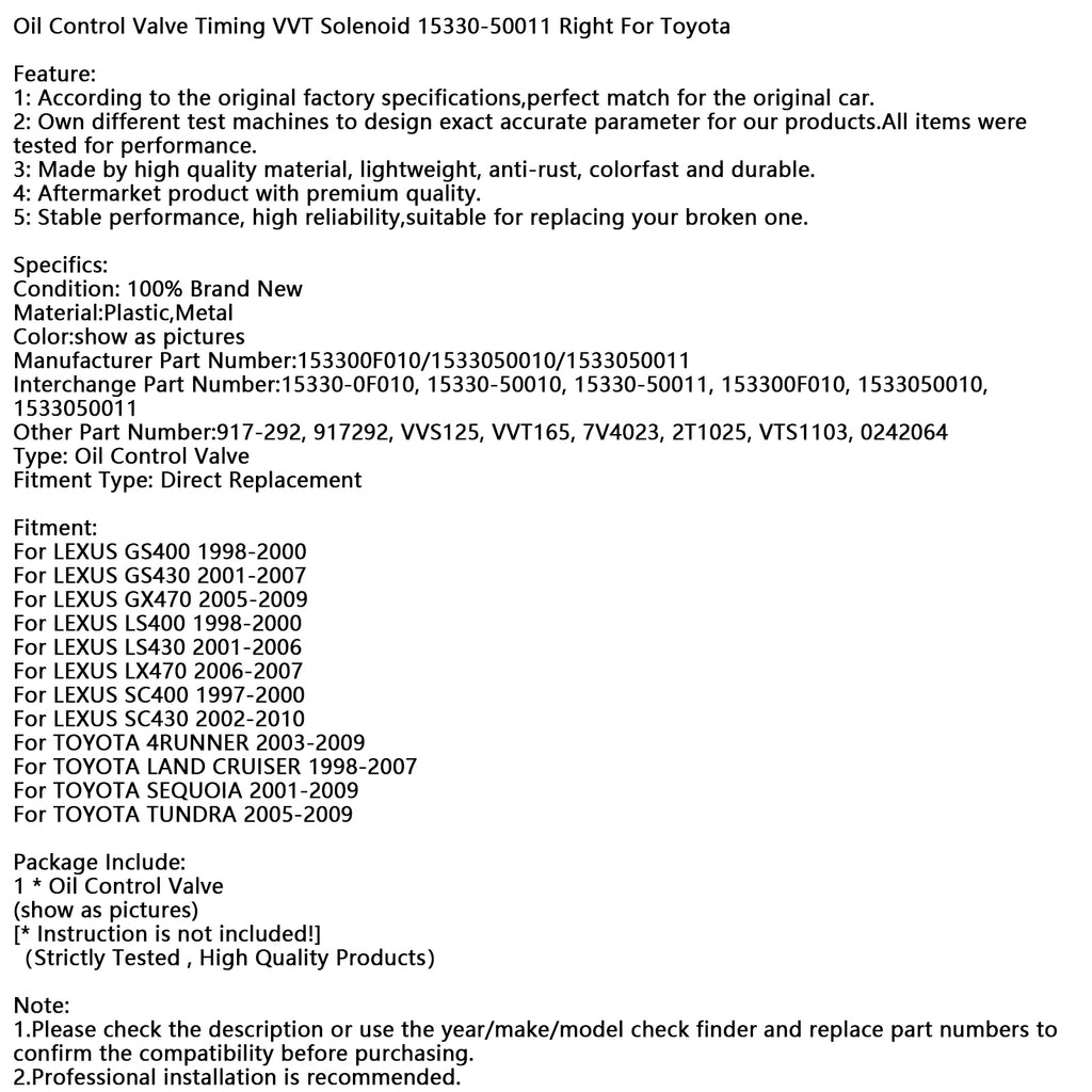 Oil Control Valve Timing VVT Solenoid 15330-50011 Right For Toyota