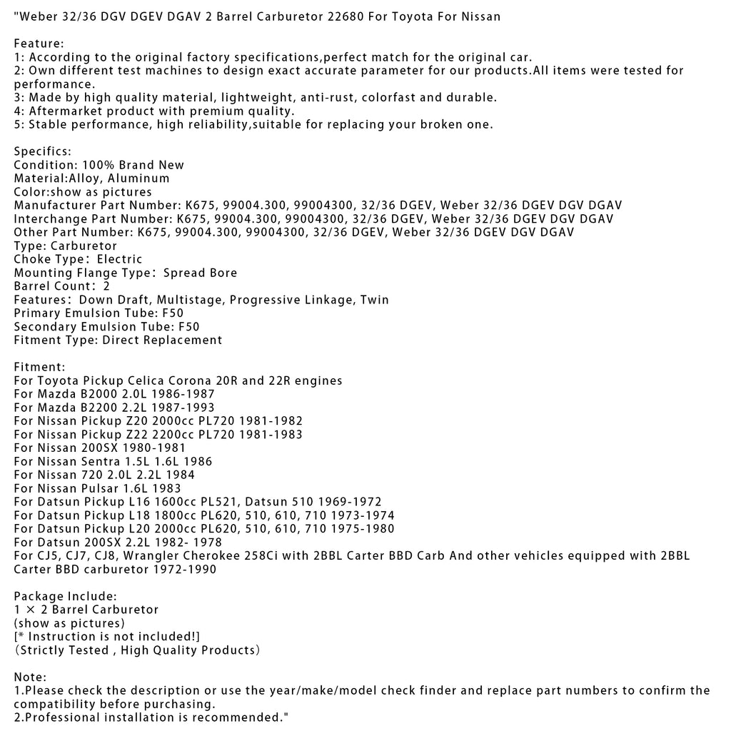 Weber 32/36 DGV DGEV DGAV 2 Barrel Carburetor 22680 For Toyota For Nissan