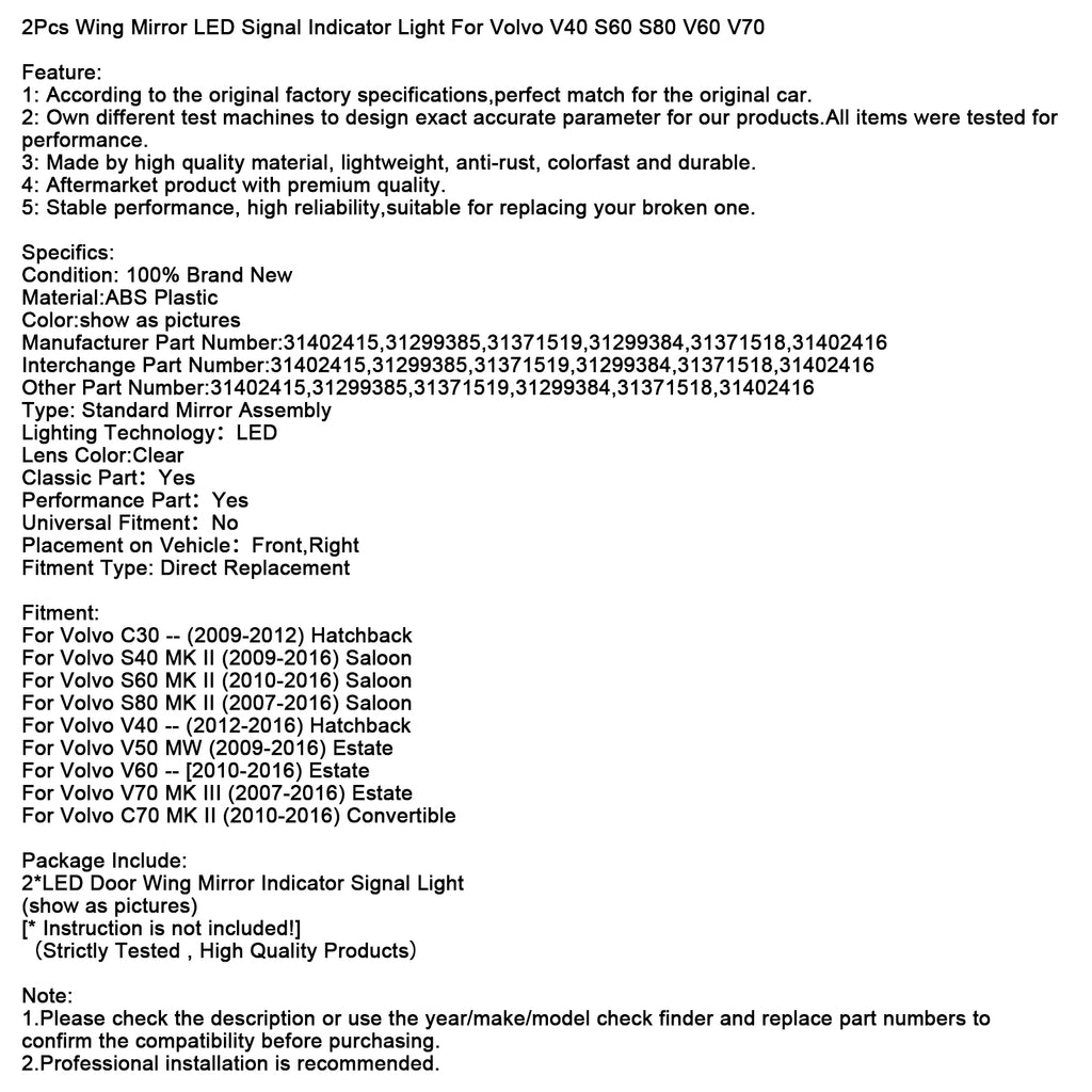 2Pcs Wing Mirror LED Signal Indicator Light For Volvo V40 S60 S80 V60 V70