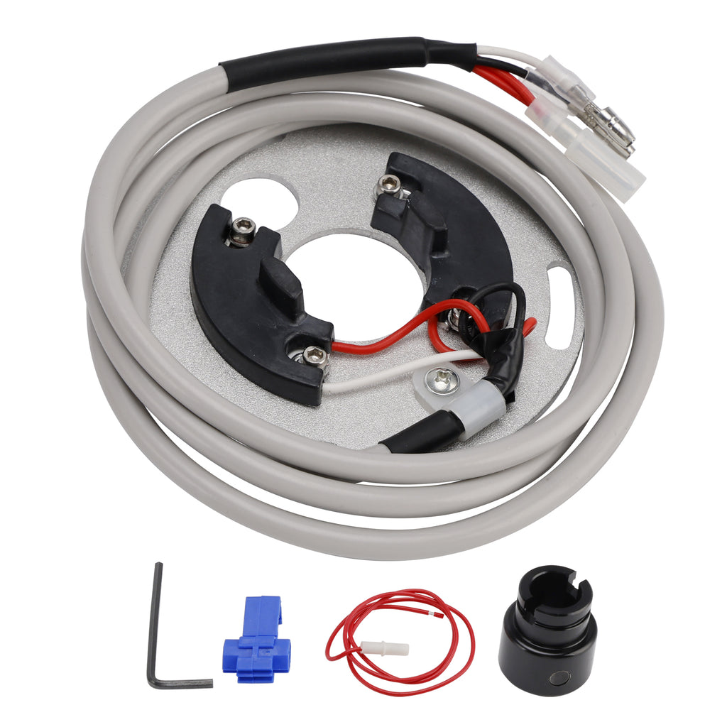 Housed behind the ignition cover and uses a magnetic rotor with the original spark advancer, so the factory advance curve is maintained.