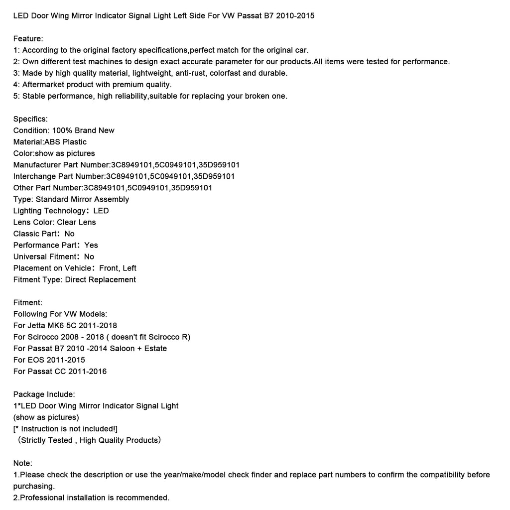 LED Door Wing Mirror Indicator Signal Light Left Side For VW Passat B7 2010-2015