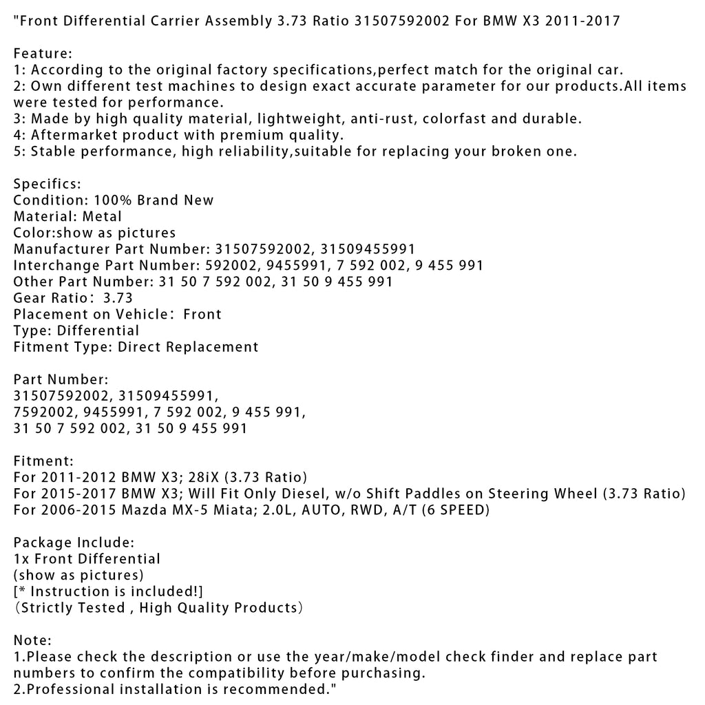 For 2015-2017 BMW X3; Will Fit Only Diesel, w/o Shift Paddles on Steering Wheel (3.73 Ratio)