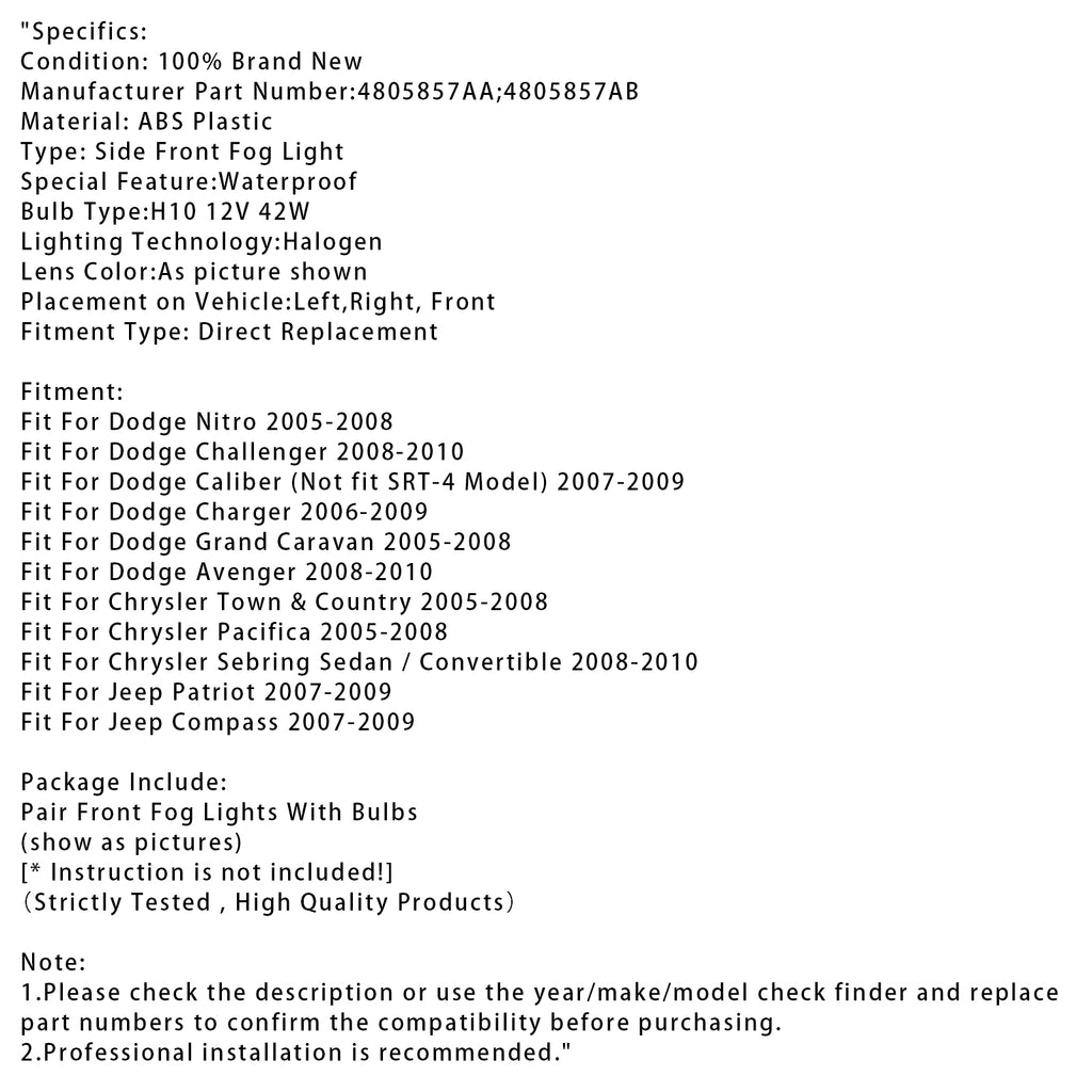 Pair Fog Lights For Dodge Chrysler Caliber Jeep Compass 4805857AA