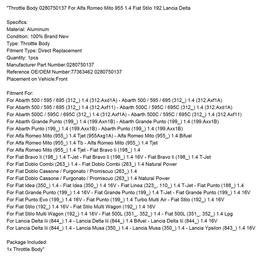 Throttle Body 0280750137 For Alfa Romeo Mito 955 1.4 Fiat Stilo 192 Lancia Delta