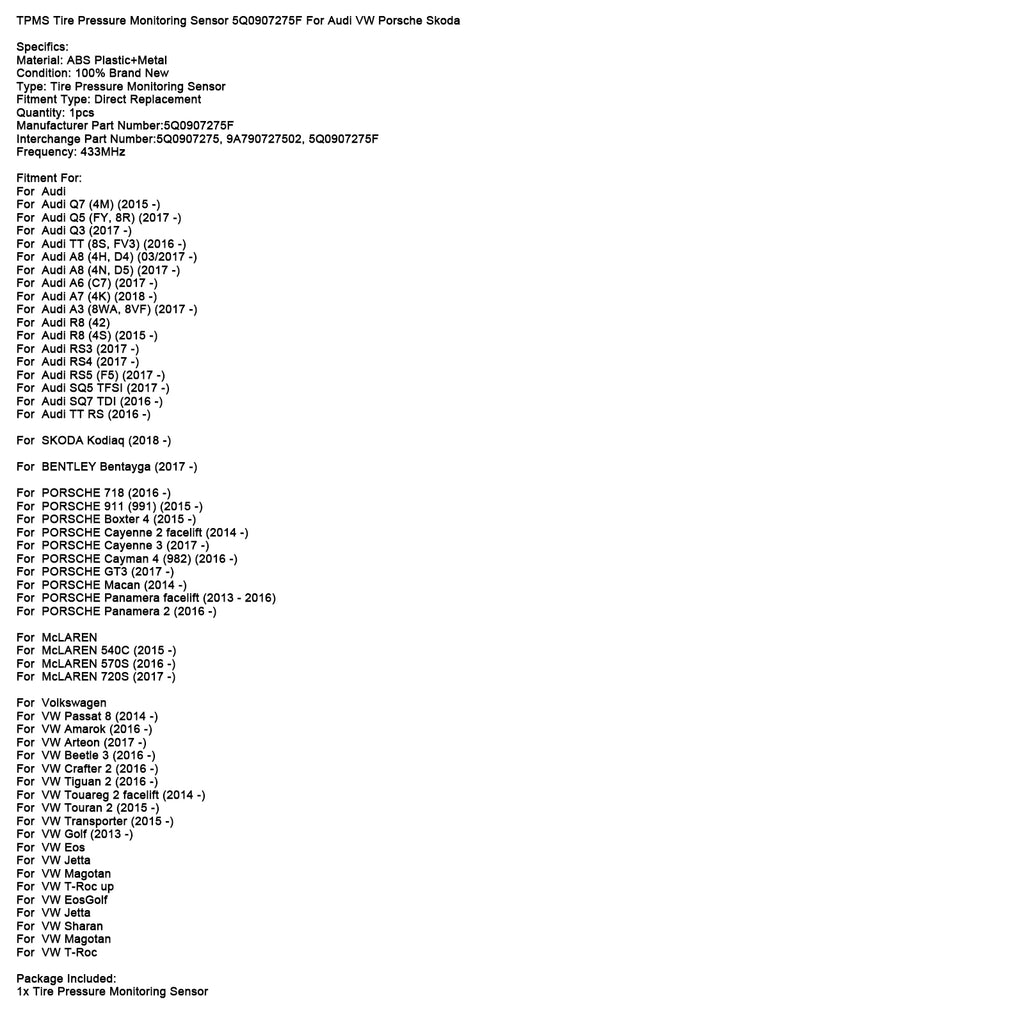 TPMS Tire Pressure Monitoring Sensor 5Q0907275F For Audi VW Porsche Skoda