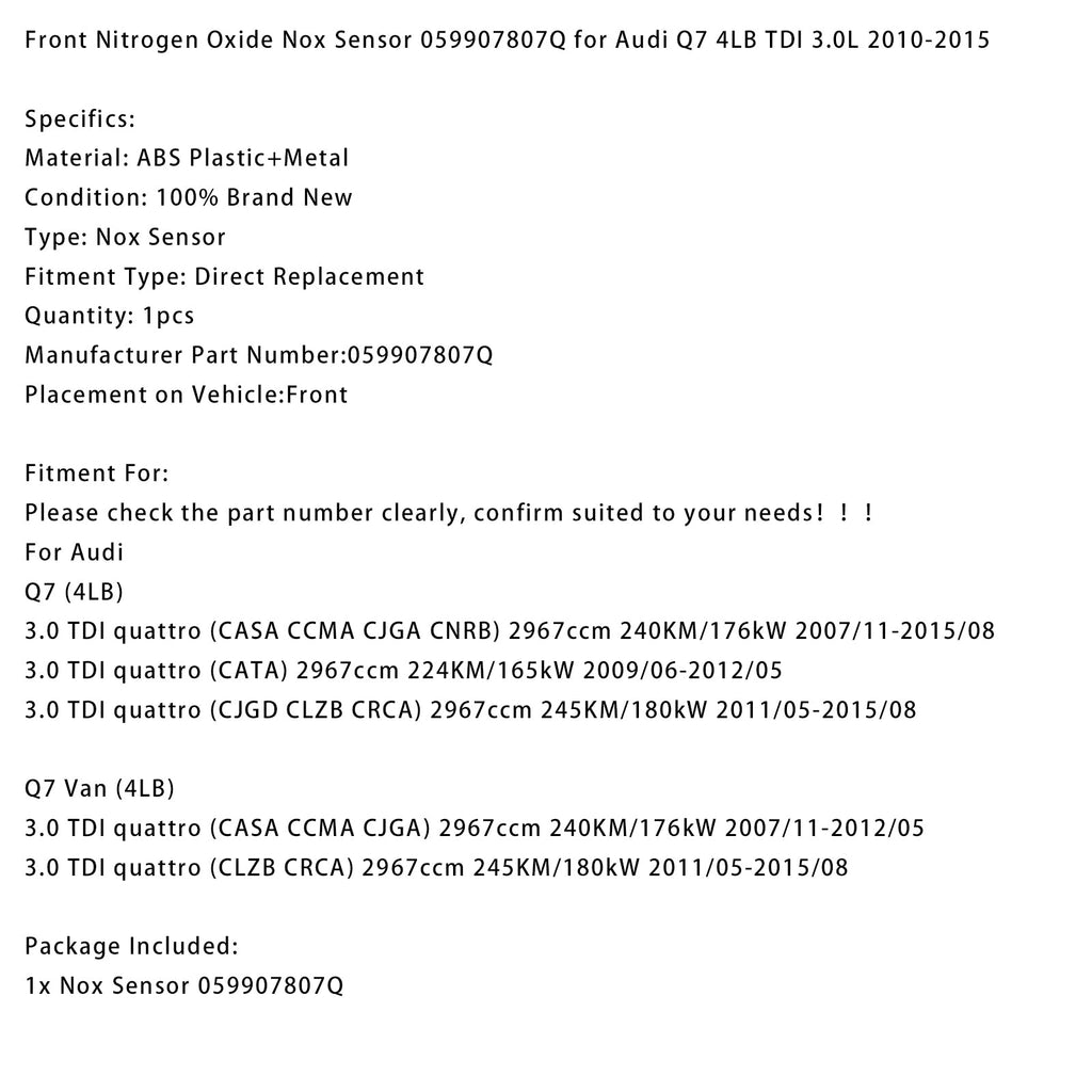 2007/11-2012/05 Q7 Van (4LB) 3.0 TDI quattro (CASA CCMA CJGA) 2967ccm 240KM/176kW Front Nitrogen Oxide Nox Sensor 059907807Q