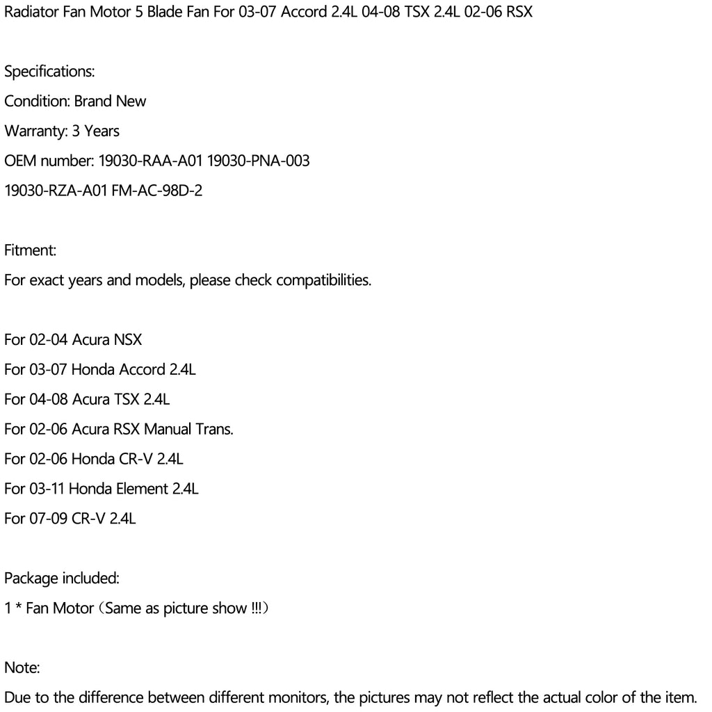 2003-2007 Accord 2.4L /2004-2008 TSX 2.4L /2002-2006 RSX Radiator Fan Motor 5 Blade Fan