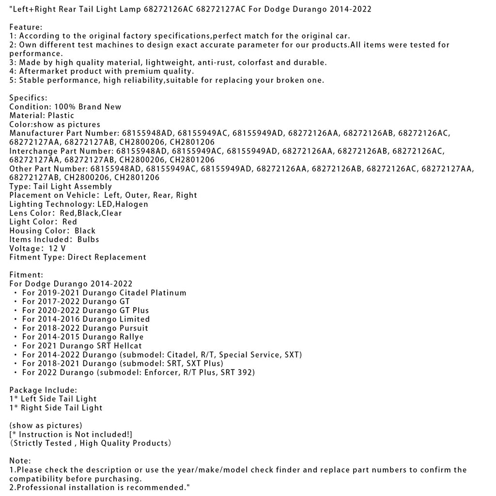 2018-2022 Durango Pursuit Left+Right Rear Tail Light Lamp 68272126AC 68272127AC
