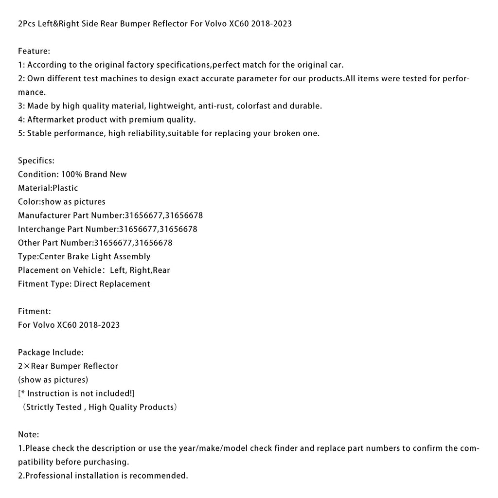 2Pcs Left&Right Side Rear Bumper Reflector For Volvo XC60 2018-2023