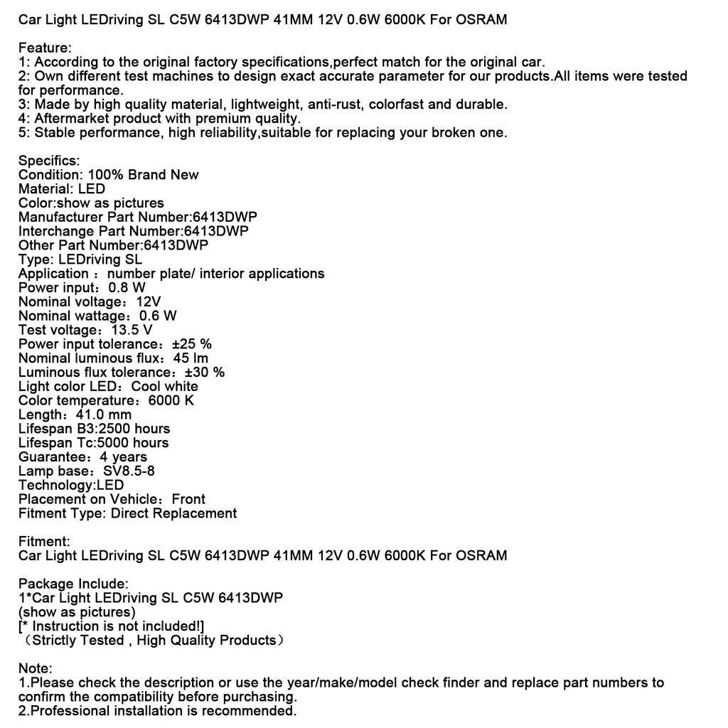 Car Light LEDriving SL C5W 6413DWP 41MM 12V 0.6W 6000K For OSRAM