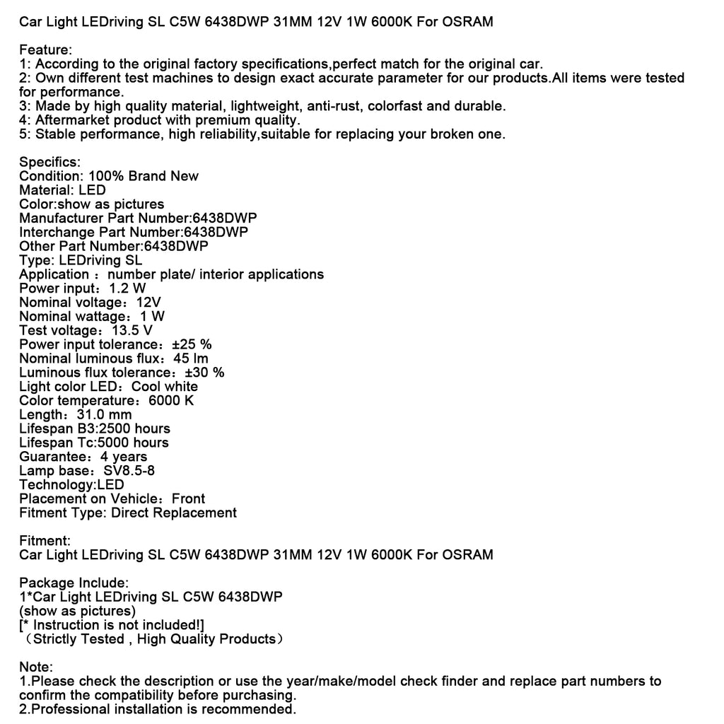 Car Light LEDriving SL C5W 6438DWP 31MM 12V 1W 6000K For OSRAM