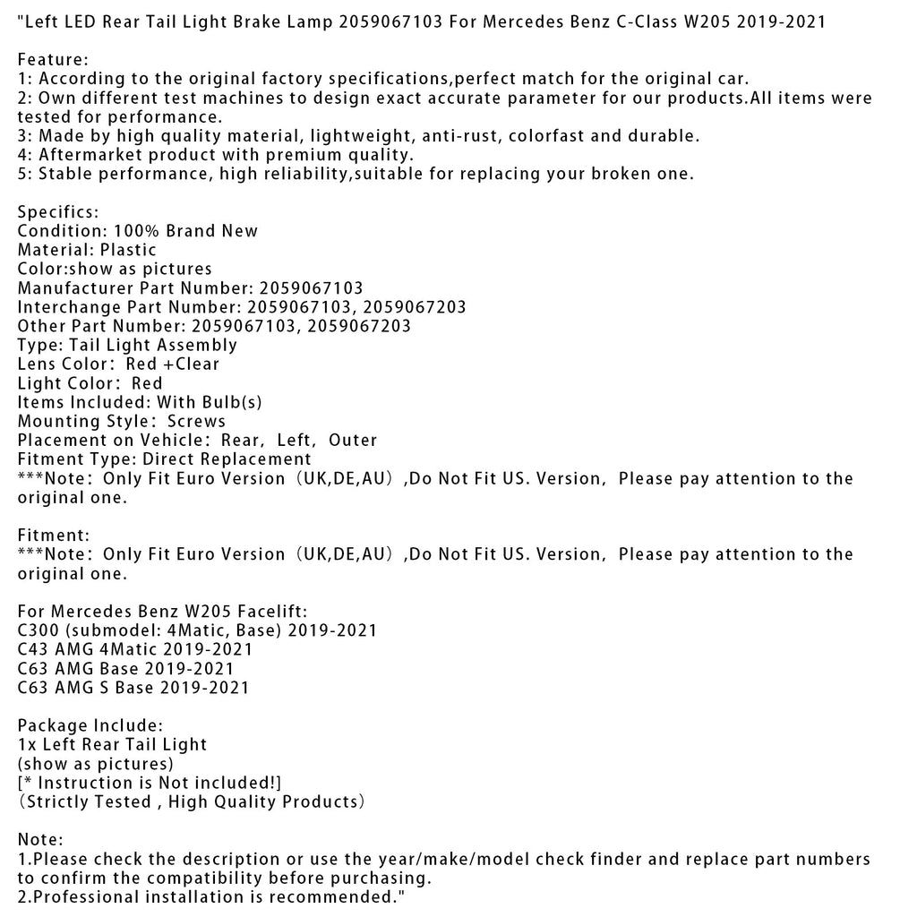 Left LED Rear Tail Light Brake Lamp 2059067103 Fit For Mercedes Benz C-Class W205 2019-2021