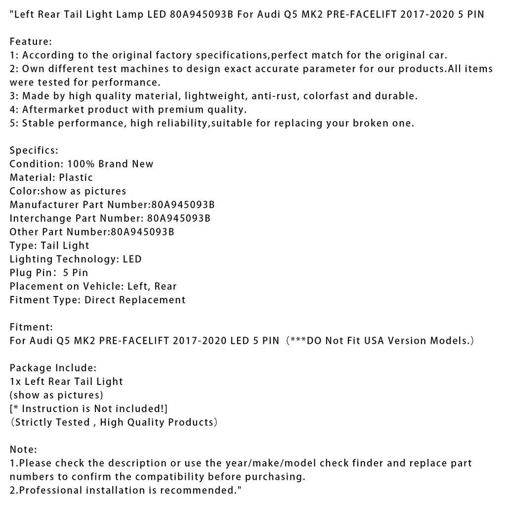 Left Rear Tail Light Lamp LED 80A945093B For Audi Q5 MK2 PRE-FACELIFT 2017-2020 5 PIN