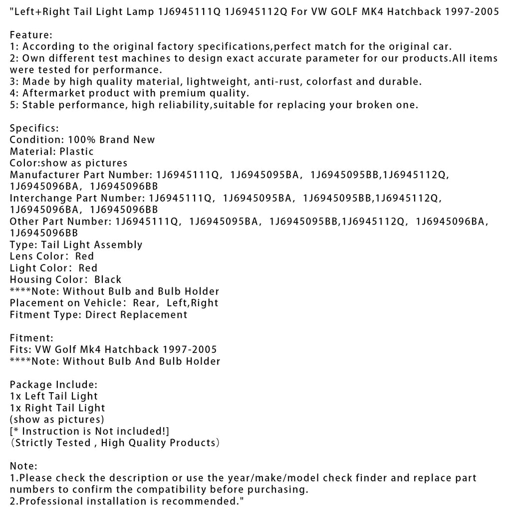Left+Right Tail Light Lamp J6945111Q 1J6945112Q Fit For VW GOLF MK4 Hatchback 1997-2005