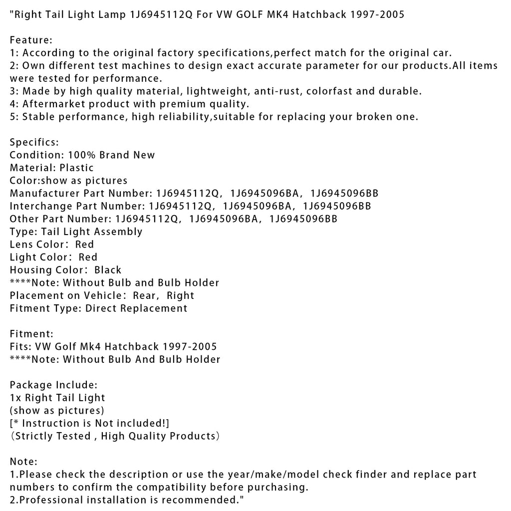 Right Tail Light Lamp 1J6945112Q Fit For VW GOLF MK4 Hatchback 1997-2005