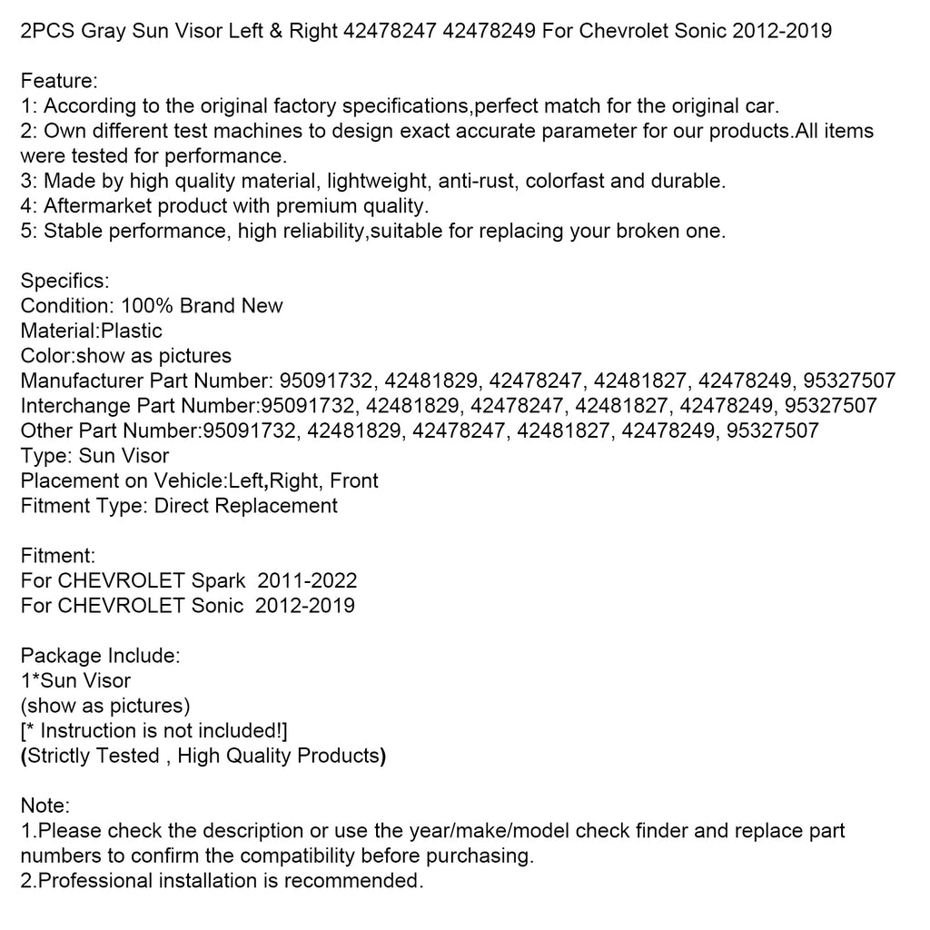 2PCS Gray Sun Visor Left & Right 42478247 42478249 For Chevrolet Sonic 2012-2019