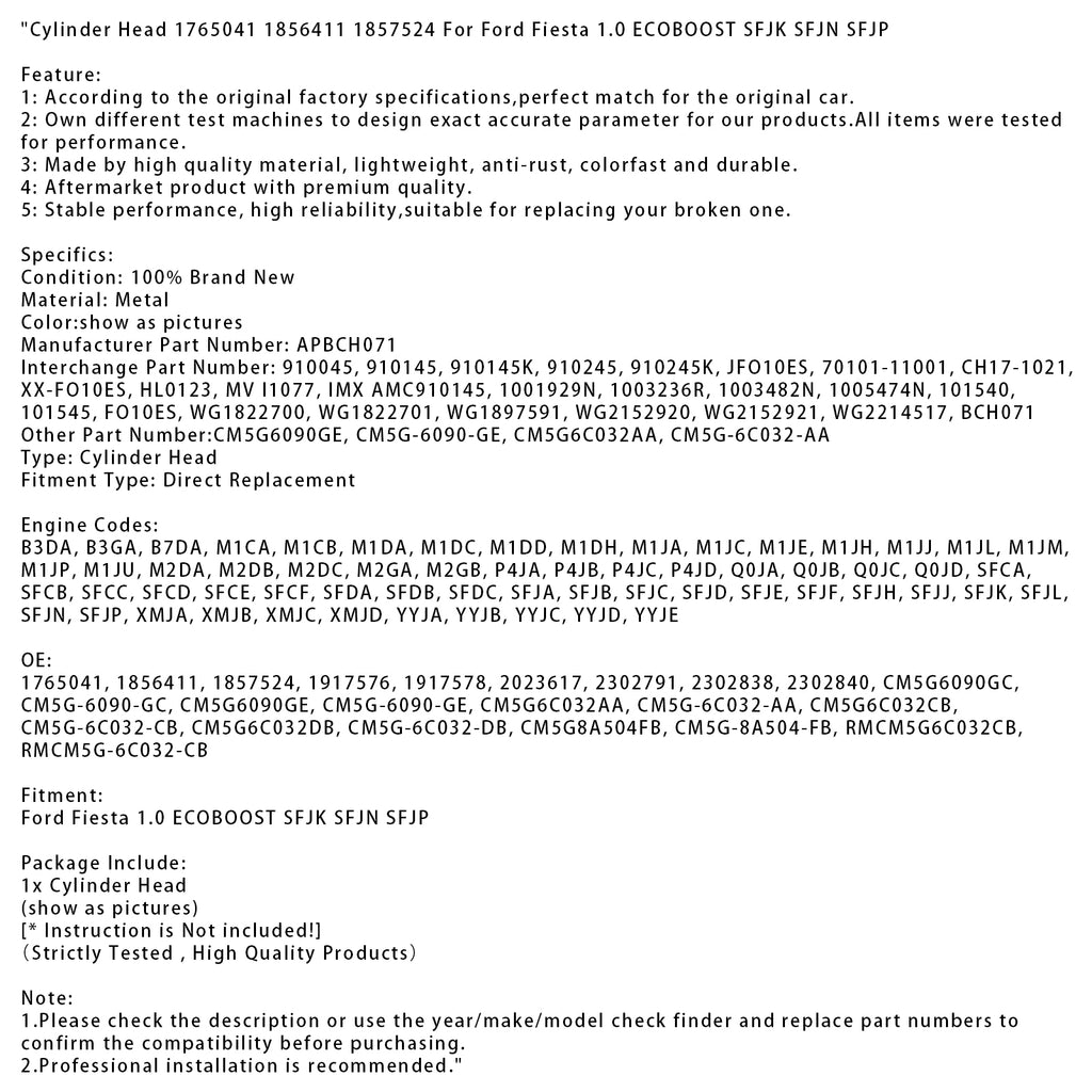 Cylinder Head 1765041 1856411 1857524 For Ford Fiesta 1.0 ECOBOOST SFJK SFJN