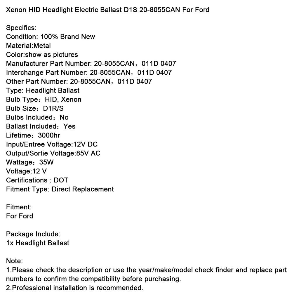 Xenon HID Headlight Electric Ballast D1S 20-8055CAN For Ford