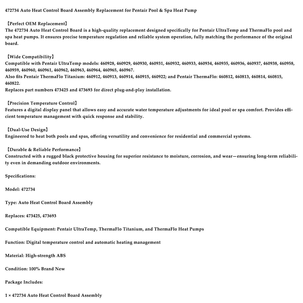 The 472734 Auto Heat Control Board is a high-quality replacement designed specifically for Pentair UltraTemp and ThermaFlo pool and spa heat pumps. It ensures precise temperature regulation and reliable system operation, fully matching the performance of the original board.