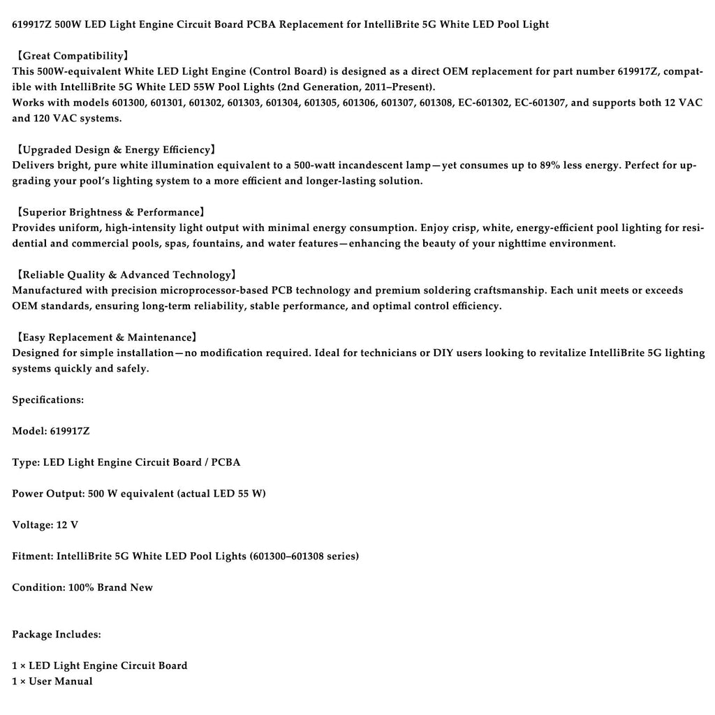This 500W-equivalent White LED Light Engine (Control Board) is designed as a direct OEM replacement for part number 619917Z, compatible with IntelliBrite 5G White LED 55W Pool Lights (2nd Generation, 2011–Present).