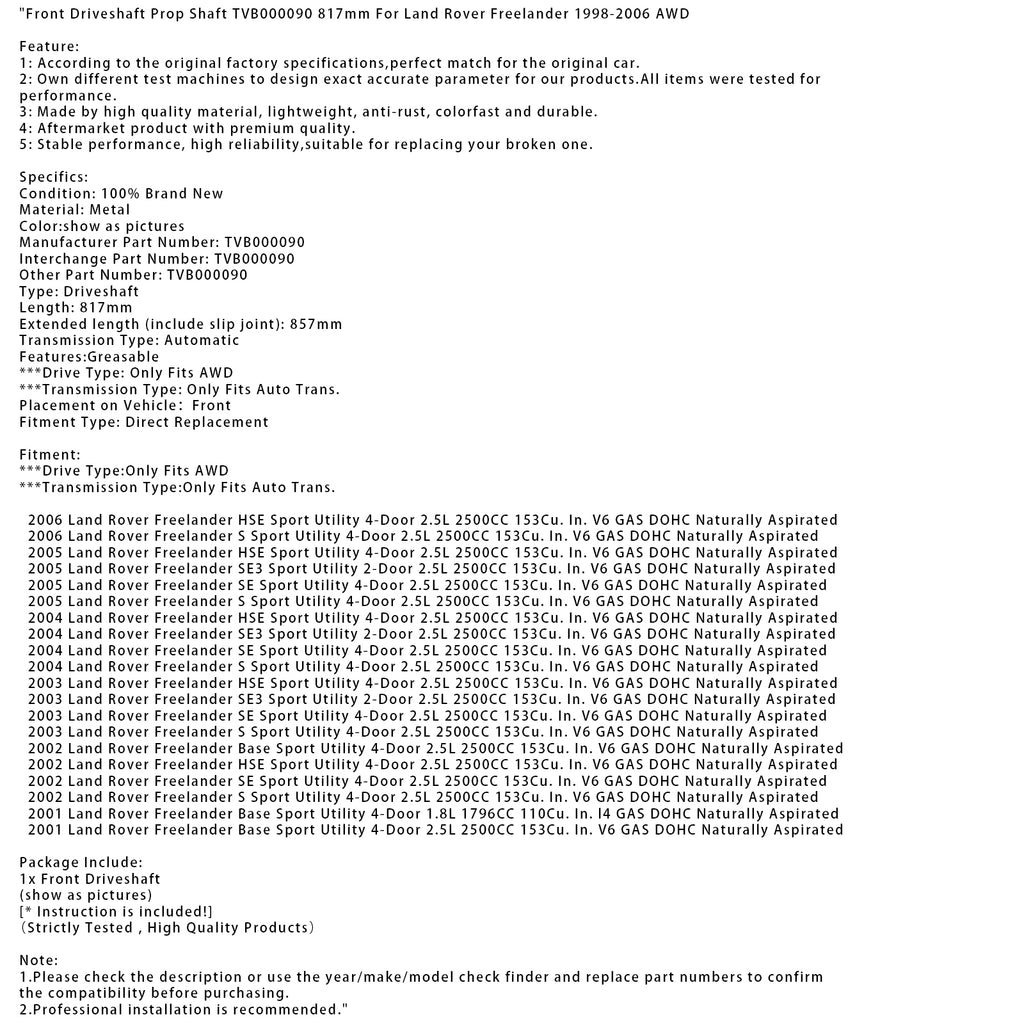 Front Driveshaft Prop Shaft TVB000090 817mm For Land Rover Freelander 1998-2006 AWD