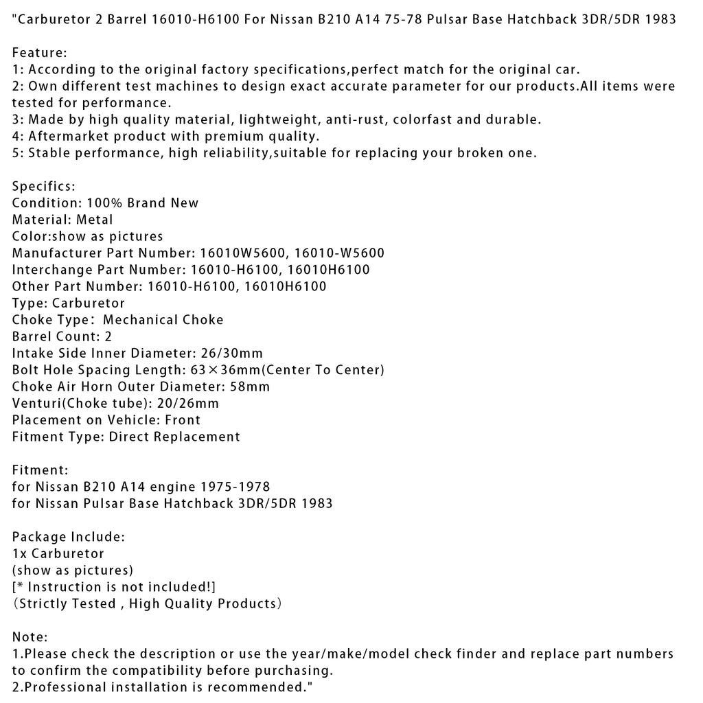Carburetor 2 Barrel 16010-H6100 For Nissan B210 A14 75-78 Pulsar Base Hatchback 3DR/5DR 1983
