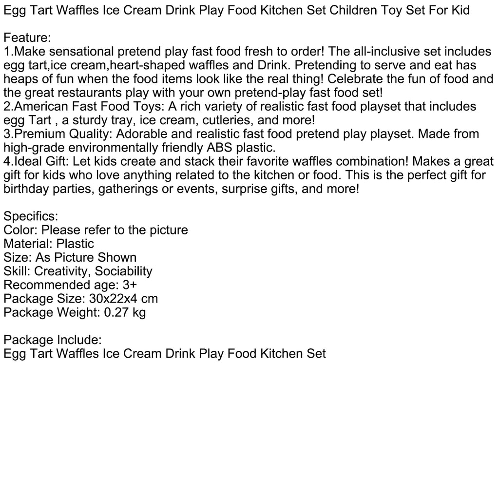 1.Make sensational pretend play fast food fresh to order! The all-inclusive set includes egg tart,ice cream,heart-shaped waffles and Drink. Pretending to serve and eat has heaps of fun when the food items look like the real thing! Celebrate the fun of food and the great restaurants play with your own pretend-play fast food set!