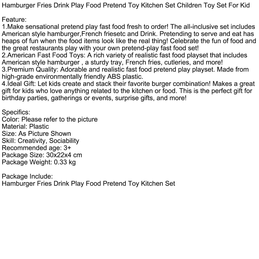 1.Make sensational pretend play fast food fresh to order! The all-inclusive set includes American style hamburger,French friesetc and Drink. Pretending to serve and eat has heaps of fun when the food items look like the real thing! Celebrate the fun of food and the great restaurants play with your own pretend-play fast food set!