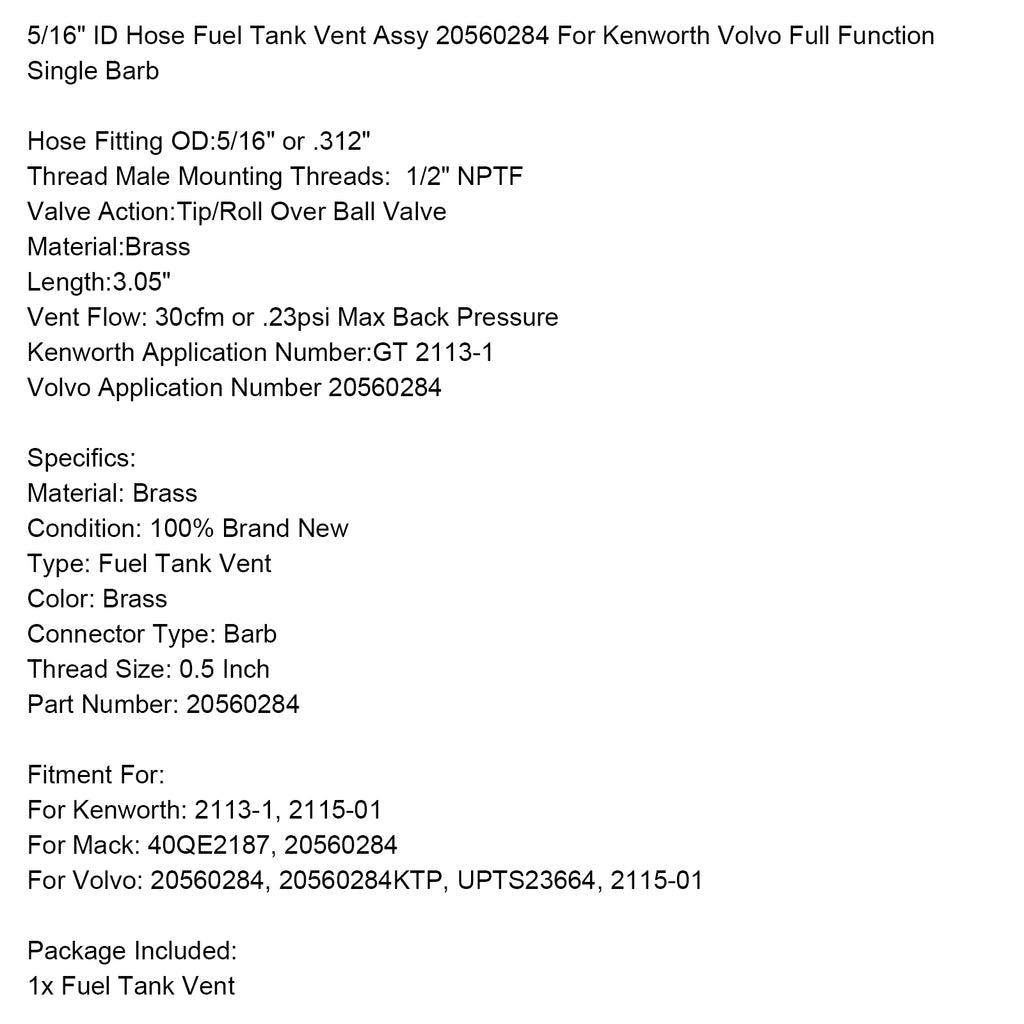 5/16" ID Hose Fuel Tank Vent Assy 20560284 For Kenworth Volvo Full Function Single Barb