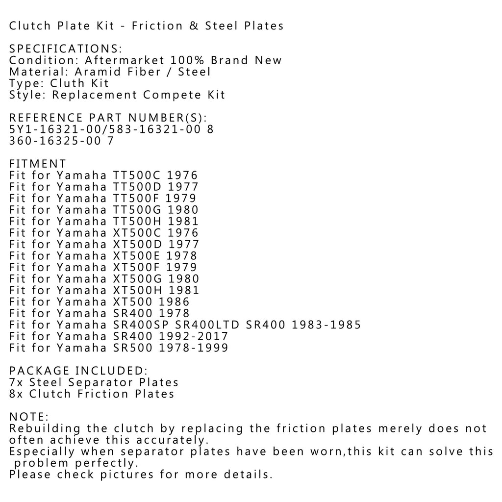 Clutch Kit Iron& Friction Plates fit for Yamaha TT500 SR400 SR400SP SR500 Generic