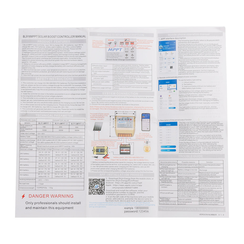 1. Boost MPPT solar controller, input 18V to charge 24V, 36V batteries, input 36V to charge 48V, 60V, 72V batteries, widely used in battery cars, RVs, outdoor battery packs and other low-power portable power supplies to recharge. Please lock the battery voltage through the mobile APP settings for first time use.
